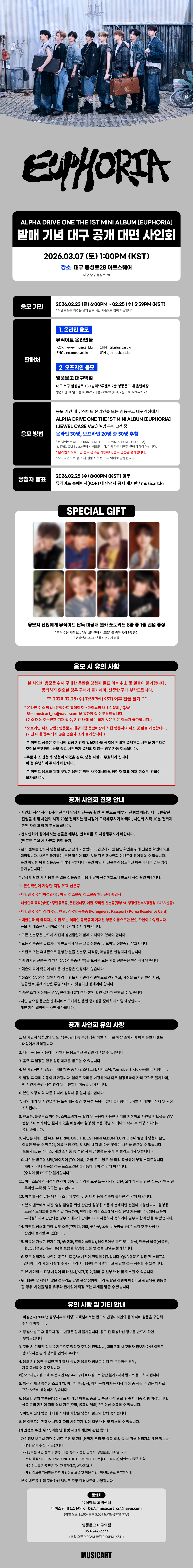 본 이벤트 상품은 대구 공개 사인회 응모권이 포함된 상품입니다. 본 사인회 응모를 위해 구매한 음반은 당첨자 발표 이후 취소 및 환불이 불가합니다. 동의하지 않으실 경우 구매가 불가하며, 신중한 구매 부탁드립니다. [취소 안내] 취소 및 환불 접수 기한 : 2026/02/25 (수) 7:59PM (KST) 까지 * 취소 접수 방법 : 뮤직아트 홈페이지 > 마이쇼핑 내 1:1문의 or Q&A 또는 musicart_cs@naver.com을 통하여 접수 부탁드립니다. (‼️취소 희망 주문번호 기재 필수‼️, 기간 내에 접수 되지 않은 건은 취소가 불가합니다.) * 취소 접수는 취소 신청하신 일시를 기준으로 처리됩니다. (CS 처리 시간 이후 신청 건은 다음 영업일에 정상 처리 되오니, CS 운영 시간과 관계없이 취소 기한 내 취소 신청 주시면 취소 가능합니다.) * 취소 시 가상계좌 환불, 카드 승인 취소 및 한도 복구까지 시간이 소요됩니다. (결제 수단 및 은행, 카드사 별 상이) 취소 후 재구매 예정이실 경우, 위 사유로 기간 내 구매를 못하였을 경우 추가 구매가 불가하니 응모 마감 당일 취소 시 유의 바랍니다. * 응모 정보의 양식 오류(-,.등 기호 누락)시, 별도로 취소 후 재구매하지 않으셔도 정상 응모 되는 점 참고 부탁드립니다. * 응모 수량 추가 희망하실 경우, 동일한 응모자 정보로 추가 구매시 정상 합산되어 별도로 취소 후 재구매 하실 필요 없이 추가 응모가 가능합니다. * 주문 취소 신청 후 당첨이 되었을 경우, 당첨 사실이 무효처리 됩니다. 이 점 유념하여 주시기 바랍니다.* 본 이벤트 응모를 위해 구입한 음반은 어떤 사유에서라도 당첨자 발표 이후 취소 및 환불이 불가합니다. [응모 양식 안내] *권장 사항 응모시, 아래 양식에 맞추어 기입을 권장드립니다. - 응모자 이름 (Name) : 내국인 한글, 외국인 영문 이름 기입- 연락처 (Phone number) : XXX-XXXX-XXXX (하이픈, - 기재)- 생년월일 (Birth) : YY.MM.DD (년.월.일 순으로 온점 구분하여 기재)- 이메일 (e-mail) : 연락이 가능한 이메일 주소 작성 이하 옵션 : 내용 확인 후 동의 하시는 경우에만 구매가 가능하며, 확인 후 체크 부탁드립니다.* 기재하신 응모 정보는 응모 마감 후 수정이 불가합니다. 기재하신 내용을 꼼꼼히 체크 후 구매 권장드립니다. [발송 안내] 한 주문 번호에 앨범 8장 구매 시 중복 없이 포토카드 8종이 증정됩니다. 여러 개의 주문 번호로 나눠서 구매할 경우 포토카드가 중복으로 증정될 수 있으니 이 점 유의해 주시기 바랍니다.